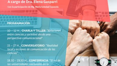La Comunicación de las Ciencias junio 25, 2018julio 3, 2018Cecilia Garcia Encuentros de trabajo con la Dra. en Comunicación Social Elena Gasparri, docente investigadora de la Universidad Nacional de Rosario 29 de junio, Salón [...]