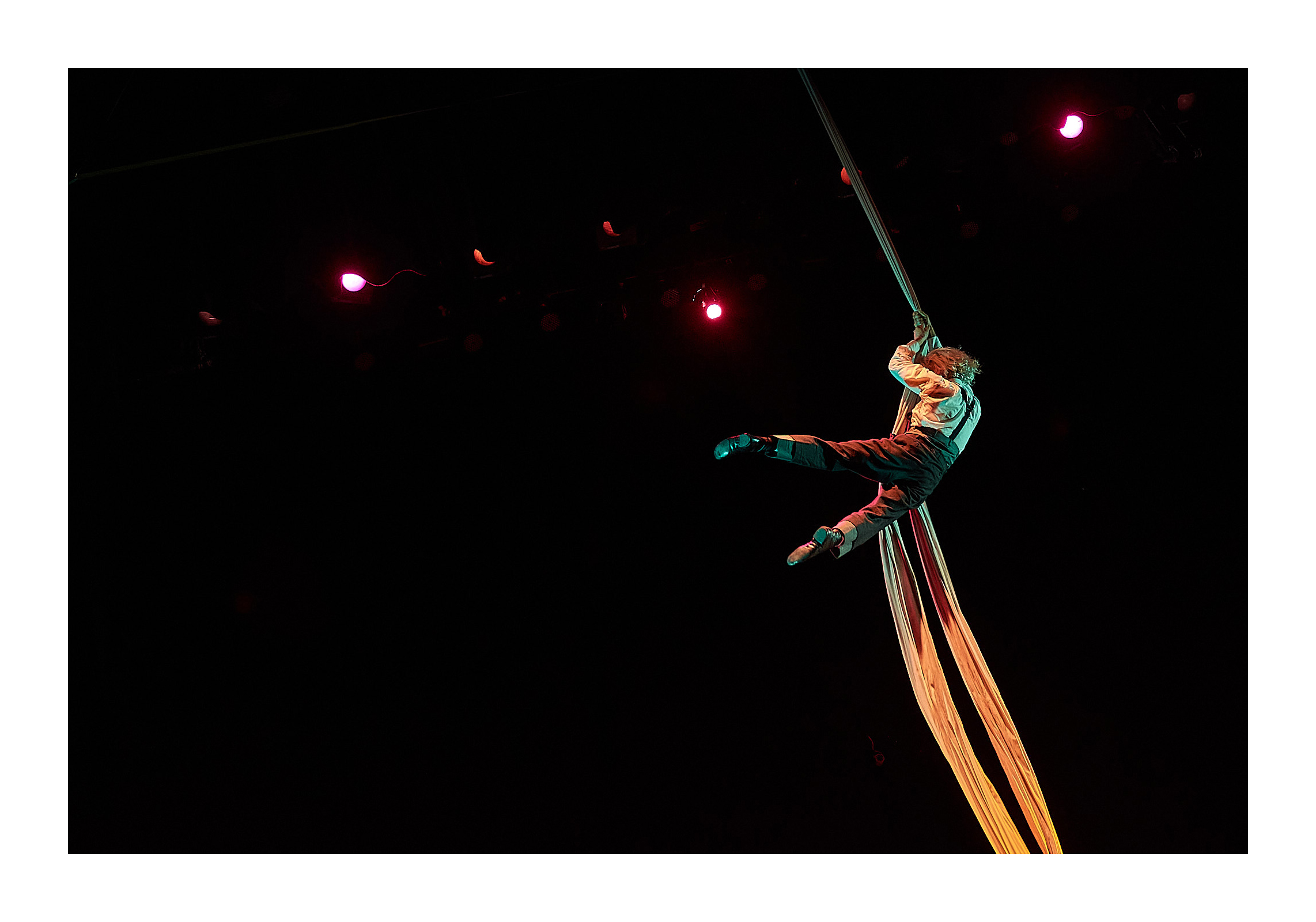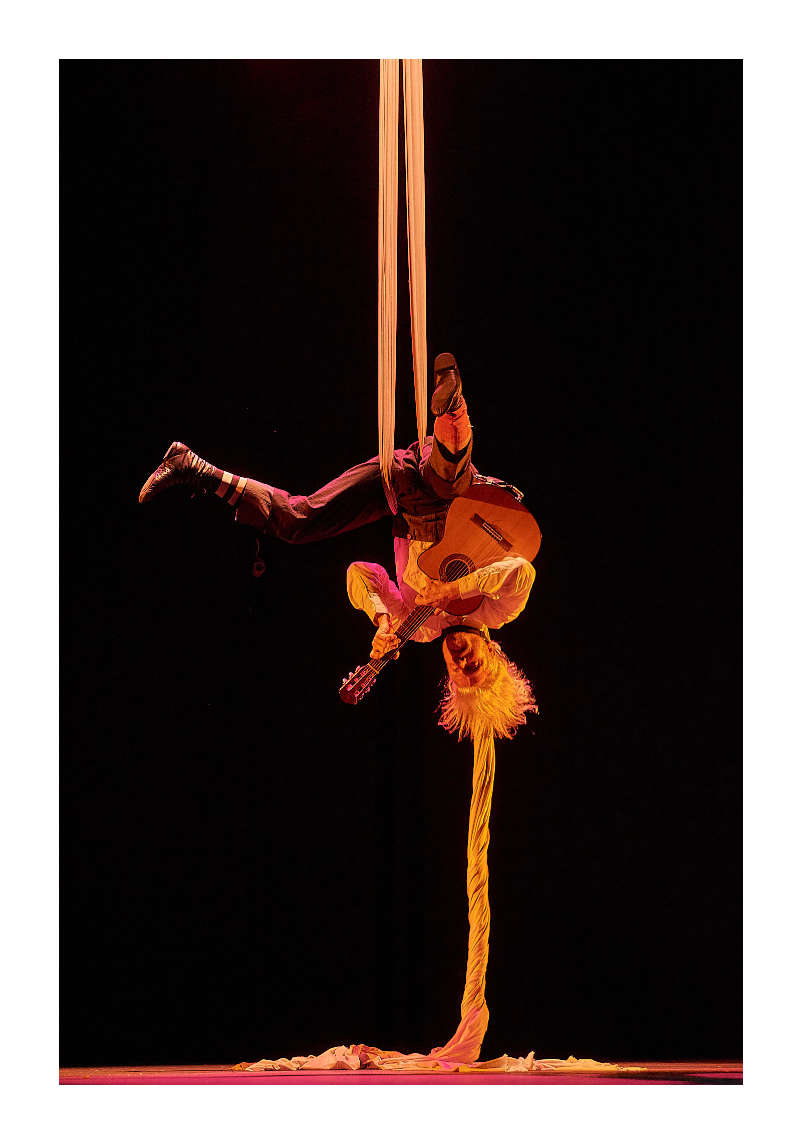 Esto es así porque Luis, valiéndose de las telas, se las ingenia para ejecutar guitarra y violín a cinco metros del suelo y contarte una buena historia musical «aérea».
