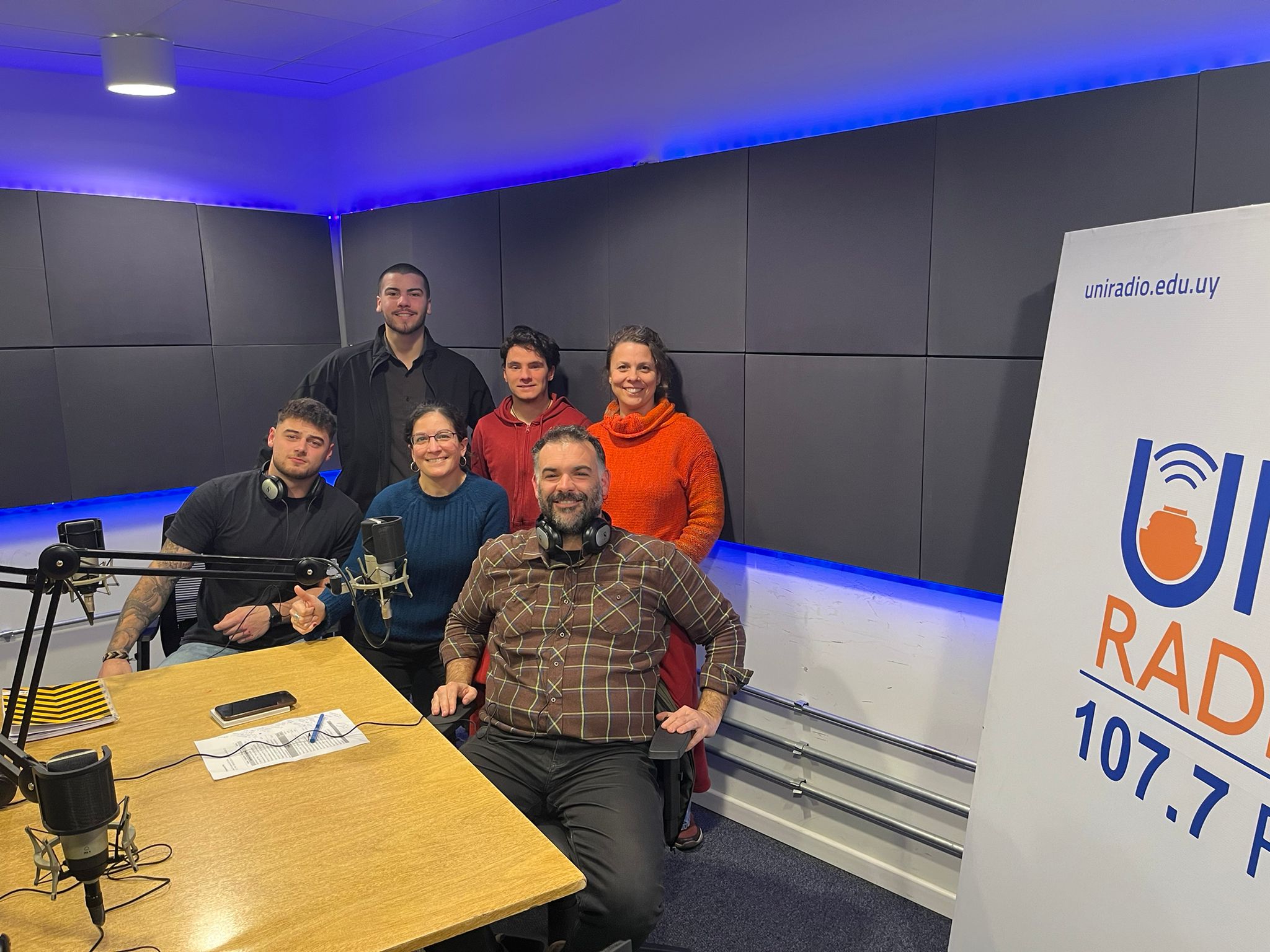 Dr. Marcelo Pérez, coordinador del PIM, Lic. Victoria Cuadrado, asistente del PIM, Facundo Franco, Martín Faliú, Francisco Forteza, alumnos de la Escuela Superior de Comunicación Social de UTU y Lorena Caro, docente del Taller de Radio en UTU